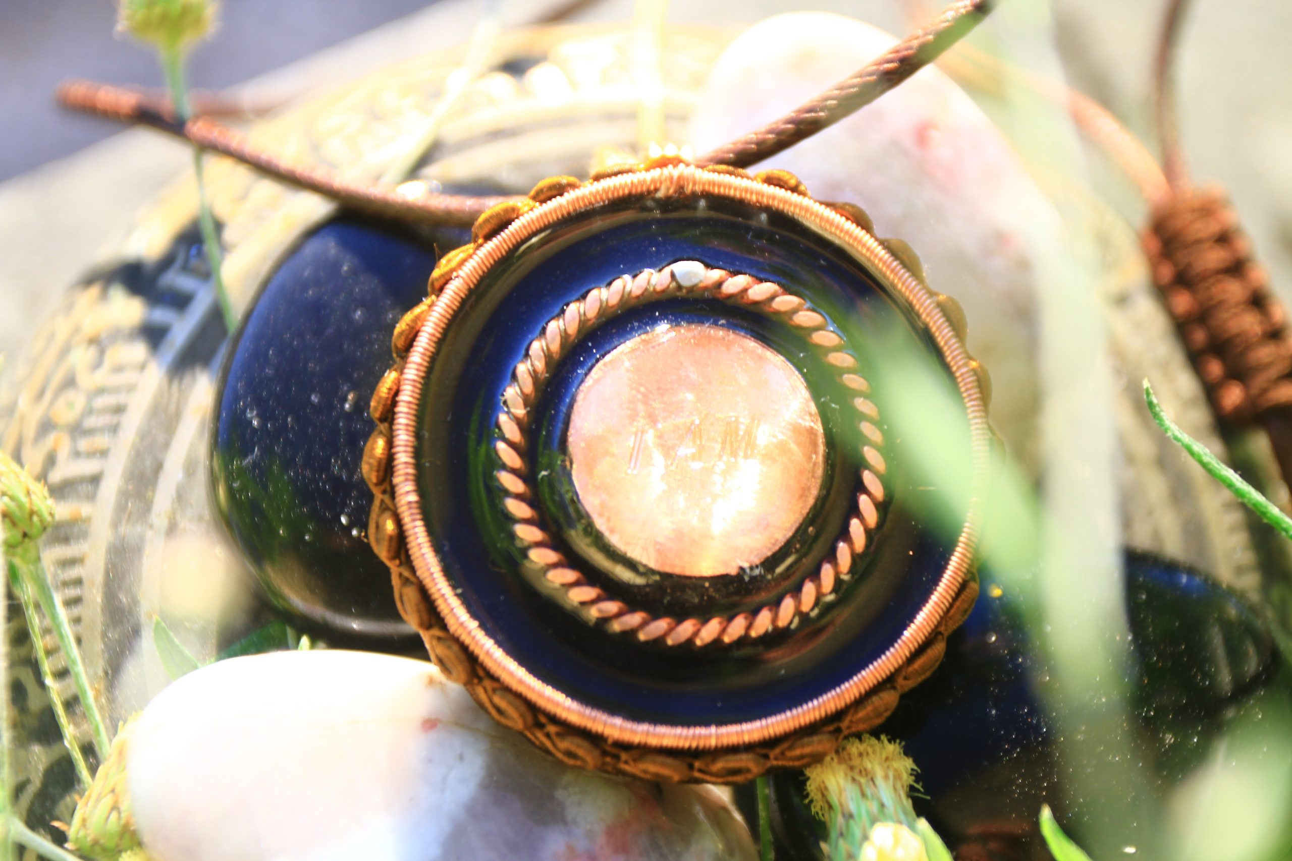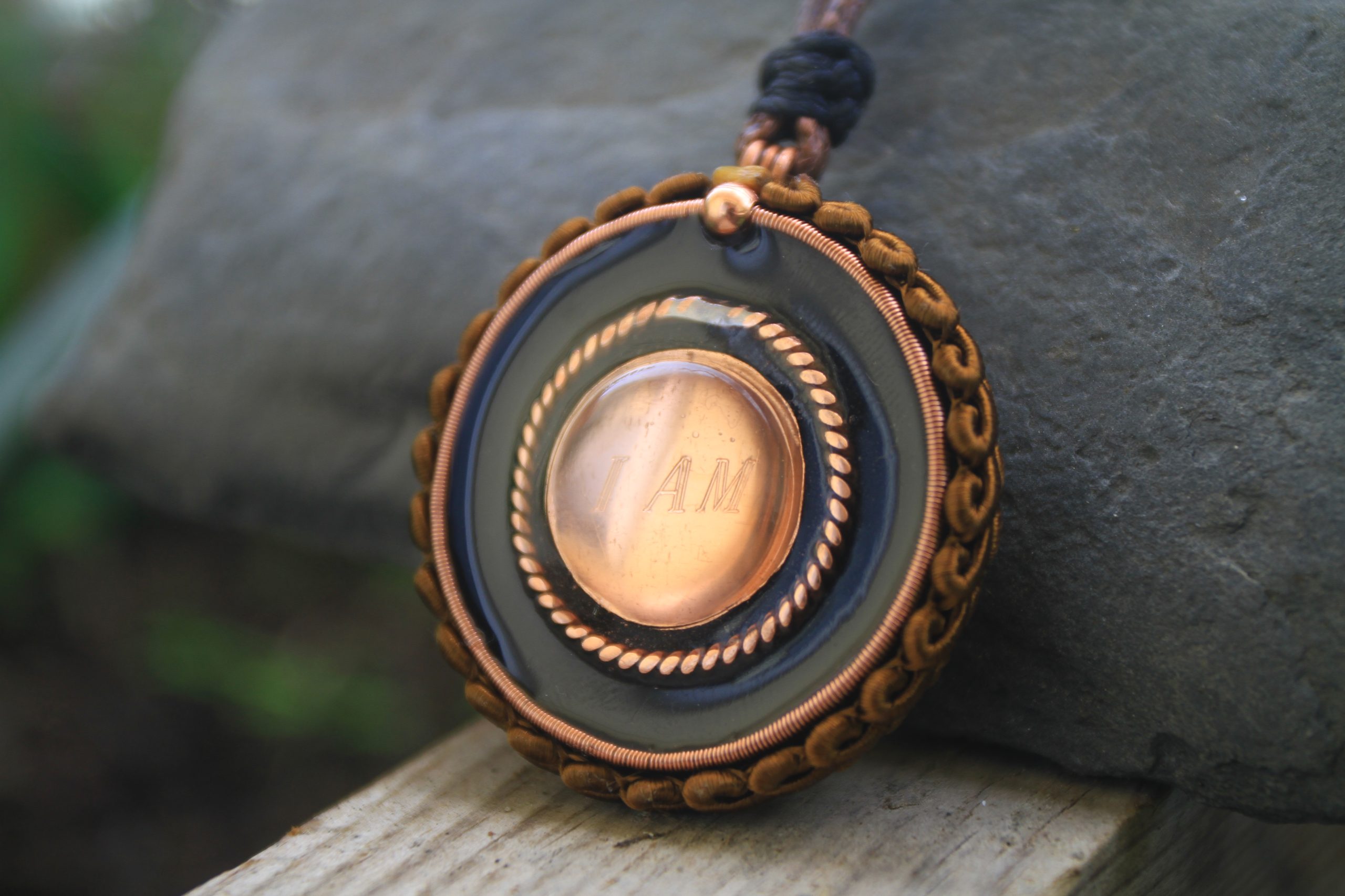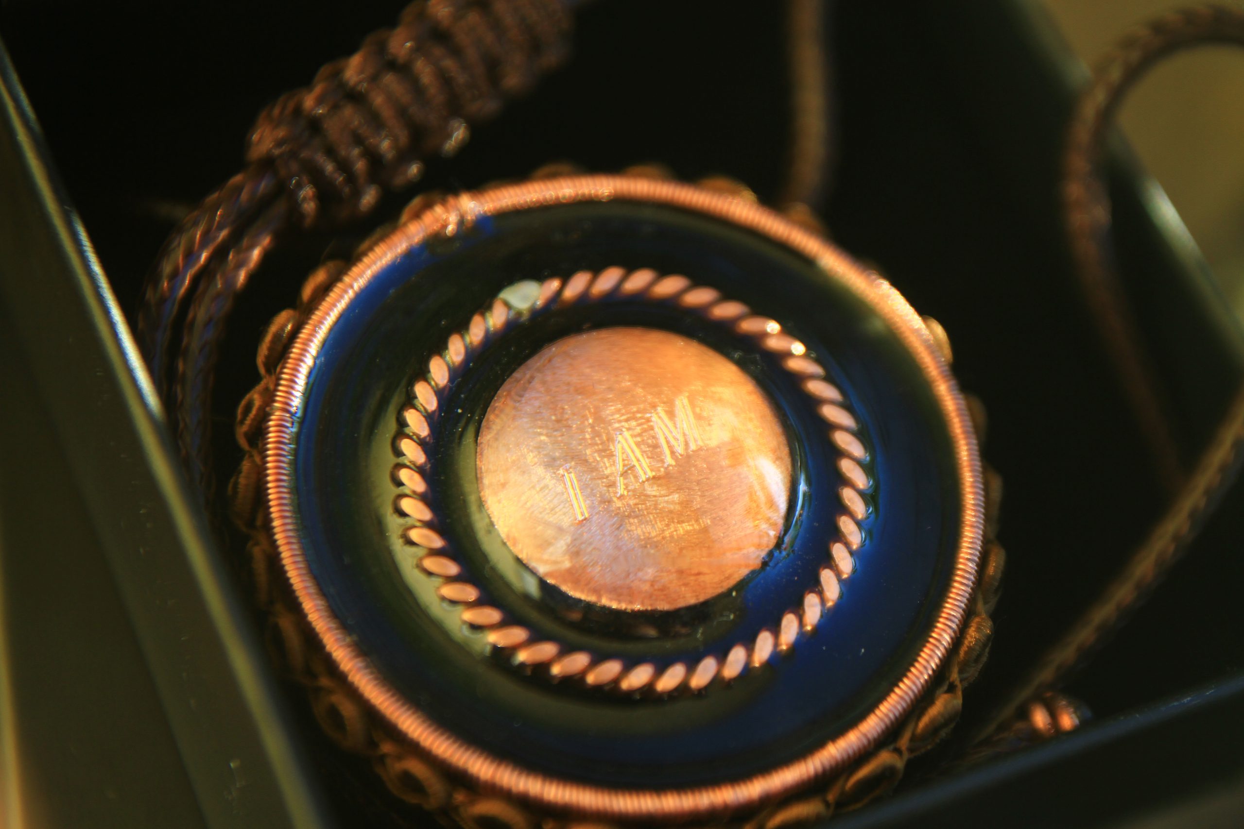 Orgonite composta por mistura equilibrada de quartzo, nano partículas metalicas, shunguite e mantra “Eu Sou” gravado à mão com diamante.