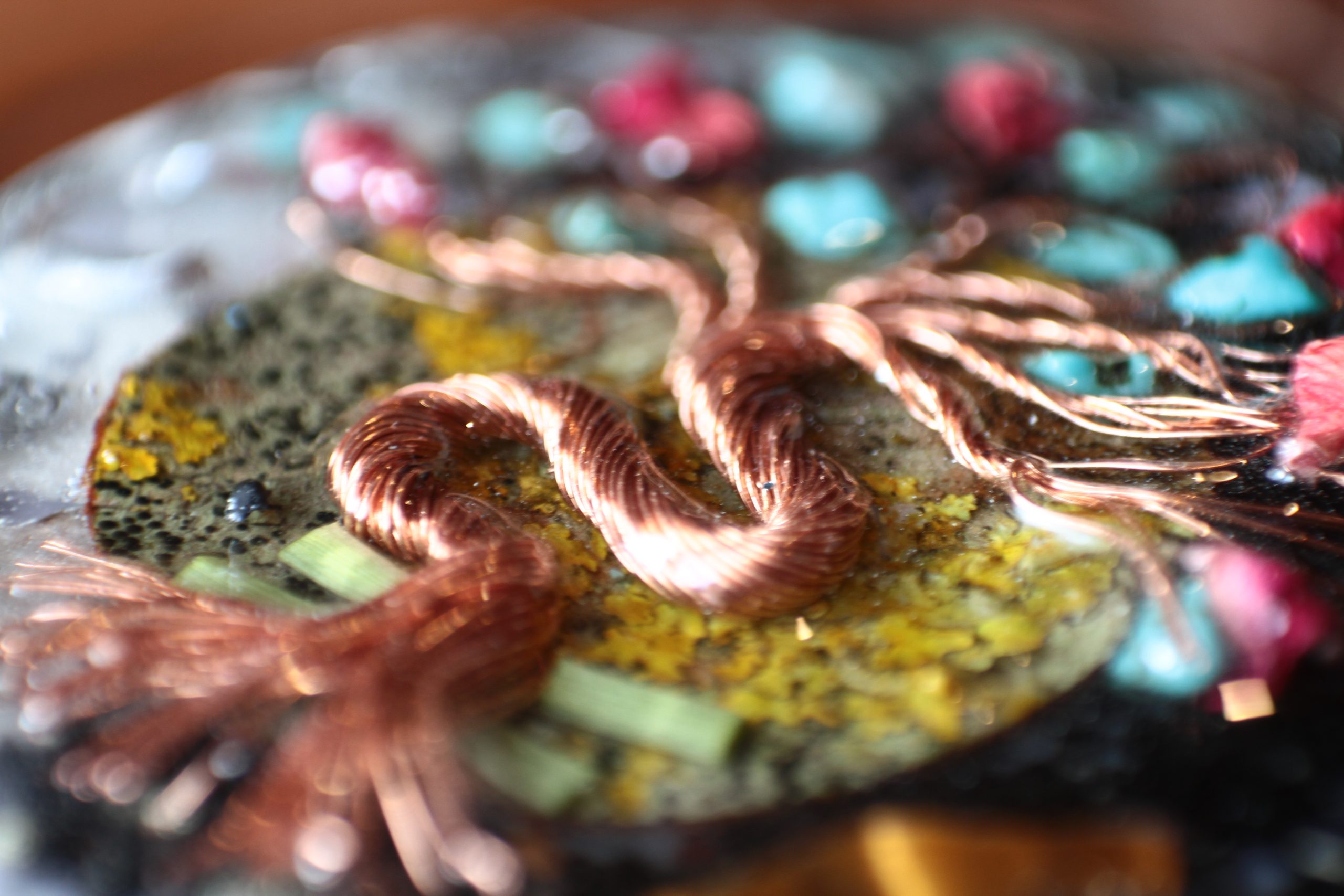Passo 2: próximo à essência vibracional é adicionado também um quartzo lemuriano com bobina de cobre. O efeito piozolétrico mantém o talismã em ação, gerando um campo vibratório de energia único.